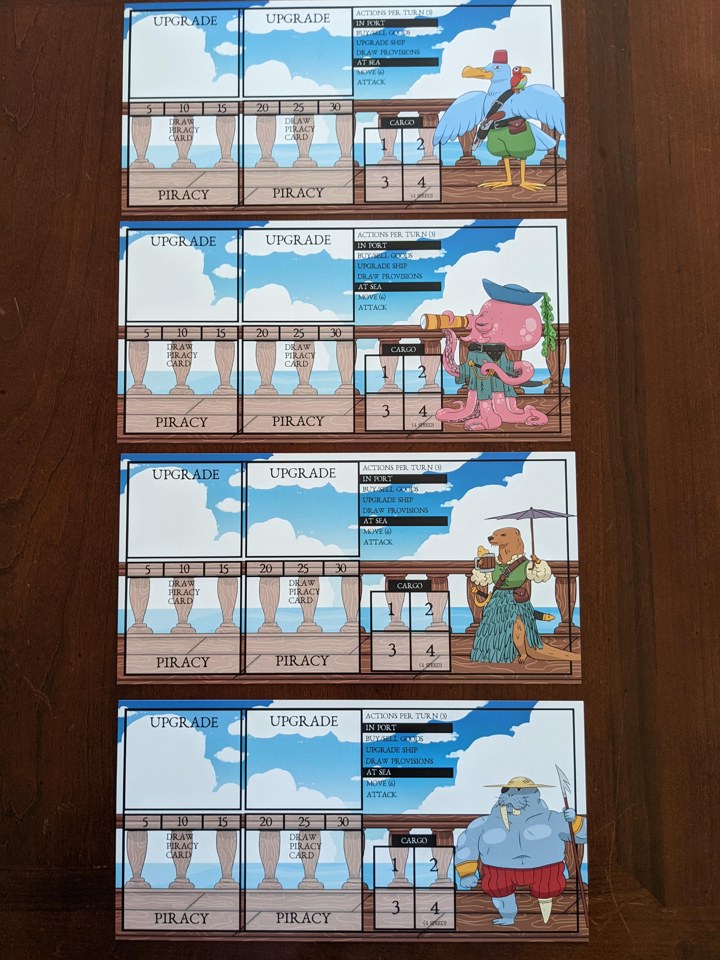 We printed through The Game Crafter, which is a very convenient way to get a game put together quickly, though there are some limitations for materials and sizes of prints so we have had to make some choices that will likely change in later editions.
